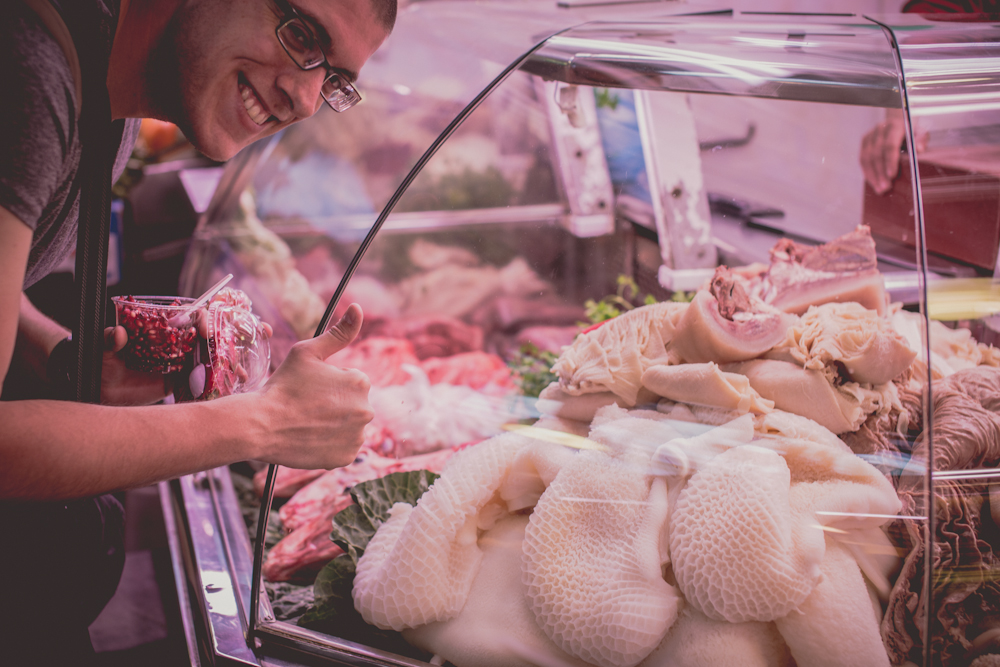 Les petites allées regorgeaient de monde, mais ça n'empêchait pas pour autant de circuler normalement. Dès qu'on passe la porte de la grande entrée, tout de suite tous nos sens sont en éveil, et on en prend plein la vue. Du rose, du jaune, du rouge, du vert. Mais pas que. Les odeurs de fruits frais, les étals de viandes, de poissons. Bref, je vous laisse découvrir tout ça en image, et puis pour les odeurs et le goûts, vous savez ce qu'il vous reste à faire.